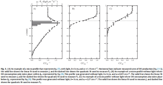 DO微剖面數(shù)據(jù):使用Unisense OX-25微電極(尖端25μm)測量WSI兩側(cè)的DO濃度垂直剖面,垂直分辨率160μm。數(shù)據(jù)用于計(jì)算J、初級(jí)生產(chǎn)率p(z)和消耗率。例如,F(xiàn)ig. 5A展示有光條件下的微剖面(J>0),F(xiàn)ig. 5B和5C展示無光條件下的微剖面(J<0)。這些數(shù)據(jù)直接驗(yàn)證了模型表達(dá)式(Eq. 7-9),并揭示了DO在沉積物中的分布動(dòng)態(tài)。研究意義:提供高分辨率空間數(shù)據(jù),使模型參數(shù)(如δp、r?1、r?2)的精確估計(jì)成為可能,支撐了WSI通量的量化。