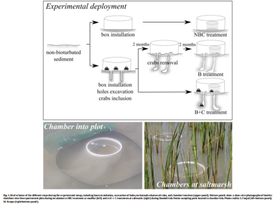 摘要指出,有機(jī)質(zhì)的再礦化在控制海洋沉積物的生物地球化學(xué)過(guò)程中起著關(guān)鍵作用。通過(guò)其掘穴活動(dòng),生物擾動(dòng)的大型動(dòng)物不僅會(huì)引起物理、化學(xué)和生物變化,影響負(fù)責(zé)有機(jī)質(zhì)再礦化的微生物群落,還可能直接影響沉積有機(jī)質(zhì)的分布和生物可利用性。本研究通過(guò)在現(xiàn)場(chǎng)操縱螃蟹和洞穴密度進(jìn)行實(shí)驗(yàn),評(píng)估了螃蟹的生物擾動(dòng)是否影響底棲代謝、沉積有機(jī)質(zhì)的數(shù)量、分布和生物可利用性。研究發(fā)現(xiàn),螃蟹的生物擾動(dòng)增強(qiáng)了潮灘和鹽沼區(qū)域的整體底棲代謝以及溶解性有機(jī)質(zhì)向水體的底棲通量。此外,生物擾動(dòng)還改變了潮灘和鹽沼中沉積有機(jī)質(zhì)的質(zhì)量、生物可利用性和分布。總體而言,生物擾動(dòng)提高了被擾動(dòng)沉積物中易分解有機(jī)碳的比例,并在易分解有機(jī)碳比例方面均質(zhì)化了沉積柱。然而,螃蟹也產(chǎn)生了生物結(jié)構(gòu)(如土堆),可能促進(jìn)高營(yíng)養(yǎng)價(jià)值有機(jī)質(zhì)的空間異質(zhì)性。生物擾動(dòng)引起的底棲代謝和有機(jī)質(zhì)可利用性的變化,將導(dǎo)致本研究區(qū)域潮間帶系統(tǒng)碳儲(chǔ)存能力的降低。