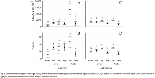 研究意義:LOC是能被底棲消費(fèi)者利用的有機(jī)碳部分。研究發(fā)現(xiàn)生物擾動(dòng)提高了沉積物柱中LOC的比例并使其分布更均勻。這表明螃蟹活動(dòng)使沉積物中的有機(jī)質(zhì)總體上變得更“新鮮”和更易被利用。
