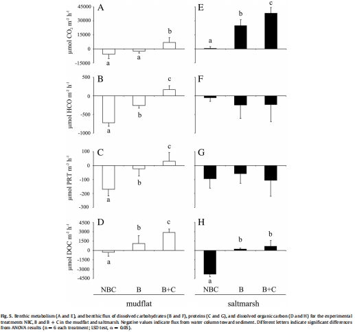 數(shù)據(jù)對(duì)比分析:比較不同處理(B+C, B, NBC)和不同生境(鹽沼 vs. 光灘)的測(cè)量數(shù)據(jù),以揭示螃蟹生物擾動(dòng)的凈效應(yīng)。