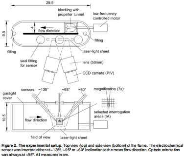 實驗驗證:在一個完全密封、無氧氣源/匯的環形水槽中,使用立體粒子圖像測速技術測量三維流速。將電化學微傳感器和光學微傳感器(optode)置于水槽中,在不同平均流速(1.7-19.2 cm s?1)和不同傳感器取向(約60°、95°、135°)下,同步記錄流速和氧氣濃度的時間序列。實驗設置如圖2所示。