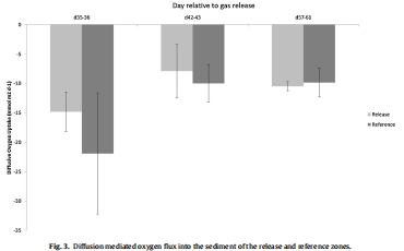 提供了沉積物代謝活動的直接指標:通過測量氧氣剖面并計算擴散性氧氣通量(圖3),研究獲得了評估沉積物有氧代謝強度的關鍵量化指標。泄漏區與參照區在此項數據上無顯著差異的結論,強有力地表明此次二氧化碳泄漏并未對沉積物中的有氧微生物活動(主要是有機質的好氧礦化)產生可測量的抑制或刺激效應。這為了解泄漏對底層生態系統核心功能(碳循環)的影響提供了直接證據。