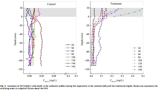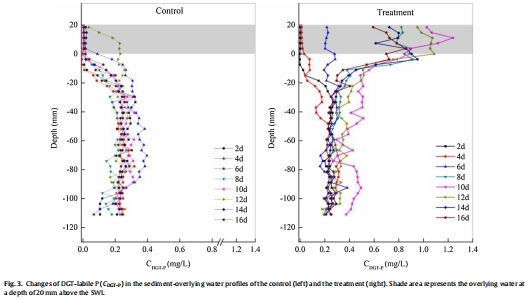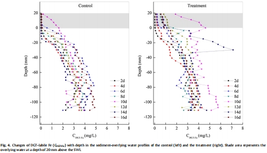 研究意義:揭示了元素在界面附近的微觀分布和遷移規(guī)律。例如,活性磷和硫在界面處出現(xiàn)濃度峰值和向上、向下的濃度梯度,表明藻華分解釋放的物質(zhì)在界面處積累并雙向擴散。而活性鐵則保持從沉積物深層向上擴散的趨勢。這些數(shù)據(jù)是計算通量和理解過程機制的基礎。該數(shù)據(jù)來自圖3(活性磷)、圖4(活性鐵)和圖5(活性硫)。