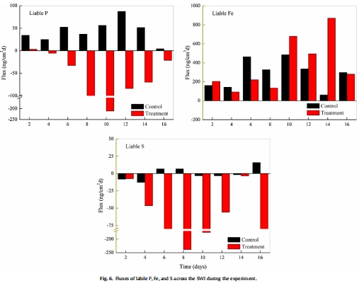 研究意義:定量評估了界面是作為元素的“源”還是“匯”。計算結果顯示,在處理組中,界面是磷和硫的“匯”(凈通量為負值,即元素從水體向沉積物遷移),但卻是鐵的“源”(凈通量為正值)。這表明藻華釋放的磷和硫部分被沉積物捕獲,而鐵則持續(xù)從沉積物釋放。該數(shù)據(jù)來自圖6。