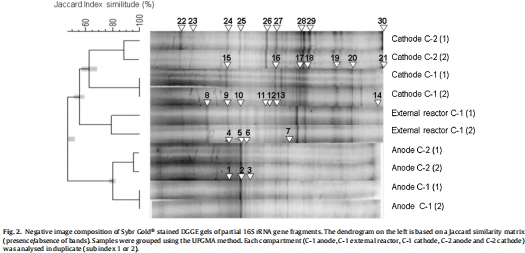 研究意義:直觀展示了不同構(gòu)型、不同單元微生物群落的差異與聯(lián)系。例如,圖2的樹狀圖顯示兩種構(gòu)型的陽極群落相似性很高(>80%),而陰極群落差異較大(65%相似性),這為性能差異提供了微生物學(xué)證據(jù)。
