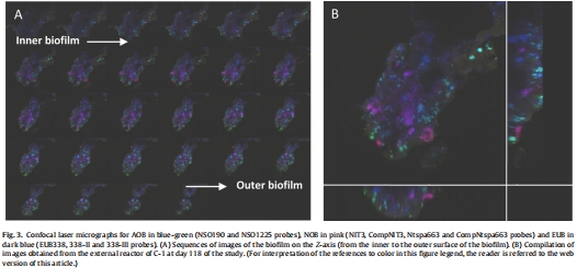 研究意義:揭示了微生物在微觀尺度上的空間組織策略。如圖3所示,在外部反應(yīng)器的生物膜中,AOB分布在外層以優(yōu)先獲取氧氣和銨鹽,NOB則在內(nèi)層被AOB包圍,以利用其產(chǎn)生的亞硝酸鹽,這種結(jié)構(gòu)優(yōu)化了硝化過程。