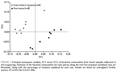 分析微生物組變化:將小鼠分為兩組——間歇性低氧暴露組(模擬嚴重OSA,6周內每天6小時間歇低氧)和常氧對照組。6周后收集糞便樣本,通過16S rRNA焦磷酸測序和QIIME生物信息學分析,比較微生物組的α-多樣性(如Shannon指數)、β-多樣性(如ANOSIM分析)以及門、科、屬水平的相對豐度。