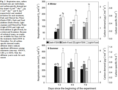 數據內容:展示了冬季和夏季不同處理下(Dark+FSW, Dark+Food, Light+FSW, Light+Food),橈足類在每個時間區間(第1-3天,第4-6天,第7-9天)的碳需求量(單位:μg C ind?1 day?1 或 % day?1)。