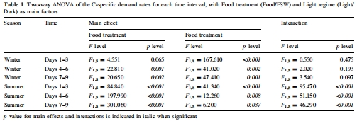 數據來源:所有碳需求量的結果均來自圖2(Figure 2)。統計分析的詳細結果(F值和p值)來自表1(Table 1),該表顯示了食物、光照及其交互作用對各時間段碳需求量的顯著性影響。
