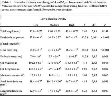 數(shù)據(jù)內容:高密度幼蟲的腸道質量和長度顯著大于低密度幼蟲,但其肝臟和脂肪體質量顯著更小。