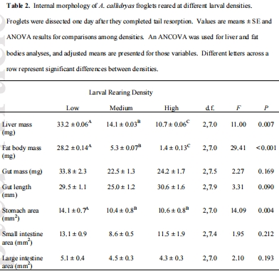 數(shù)據(jù)內容:盡管來自高密度組的幼蛙體型顯著小于低密度組,但其腸道長度和質量并無差異,導致其相對腸道長度更長;而肝臟和脂肪體大小隨幼蟲密度增加而顯著減小。