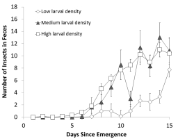 數(shù)據(jù)內容:一次性投喂葉蟬后,葉蟬頭殼主要在第二天出現(xiàn)在糞便中。計算出的平均留存時間約為2.22天,且在不同幼蟲密度組間無顯著差異。