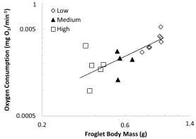 數(shù)據(jù)內容:幼蛙的代謝率與體重呈顯著正相關(異速生長斜率約為1.16),但在控制了體重因素后,不同幼蟲密度組間的體重特異性代謝率無顯著差異。