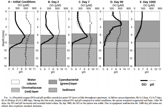 微生物墊通過(guò)其光合作用(主要是藍(lán)細(xì)菌)在魚(yú)體周?chē)蛢?nèi)部創(chuàng)造了并維持了富氧和堿性的微環(huán)境,這與傳統(tǒng)認(rèn)為軟組織保存需要缺氧條件的觀點(diǎn)不同。