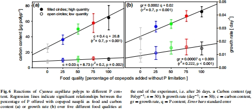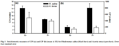 數據內容:測量了藻類和橈足類的C:N和C:P比率。P限制的藻類和橈足類具有顯著更高的C:P比。