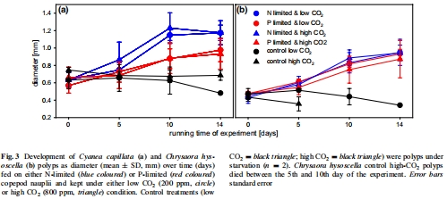 數據內容:C. capillata息肉的直徑增長受食物質量和數量的顯著影響,但不受CO?濃度影響。P限制的食物導致生長減緩。Ch. hysoscella的生長則不受CO?或食物質量的顯著影響。
