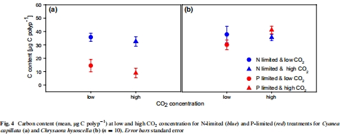 數據內容:實驗結束時,C. capillata息肉的單位個體碳含量。喂食P限制食物的息肉碳含量(約11.7 μg C/息肉)僅為喂食N限制食物個體(約34.1 μg C/息肉)的三分之一。CO?無顯著影響。