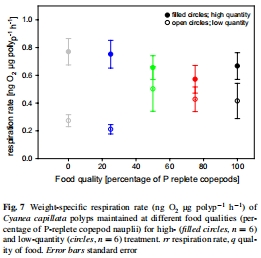 精確量化代謝活動,區分食物數量與質量的影響:Unisense系統是一種高精度的閉路呼吸計,能夠實時測量微小呼吸室(750 μL)中氧氣濃度的變化。本研究利用它獲得了C. capillata息肉的重量特異性呼吸速率。數據顯示,食物數量是驅動代謝率變化的主要因素,高食物量下的息肉代謝更為活躍。然而,食物質量(P含量)對呼吸速率沒有產生顯著影響(圖7)。這一發現至關重要,因為它將“食物數量效應”和“食物質量效應”的生理機制區分開來。