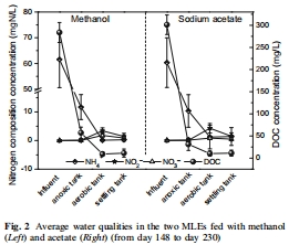 數據內容:兩個系統在穩定運行期間(第148-230天)的DOC平均去除效率(甲醇系統96.0%,乙酸鈉系統96.3%)和總氮(DTN)平均去除效率(甲醇系統93.5%,乙酸鈉系統92.0%)均很高且無顯著差異。但乙酸鈉系統好氧池的亞硝酸鹽(NO??)濃度(4.3 mg N/L)顯著高于甲醇系統(3.4 mg N/L)。