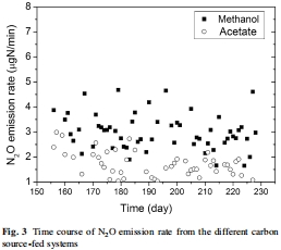數據內容:甲醇系統的平均N?O排放速率(3.0 ± 0.7 μg N/min)顯著高于乙酸鈉系統(1.6 ± 0.6 μg N/min)。甲醇系統和乙酸鈉系統的N?O轉化率(排放N?O占去除總氮的百分比)分別為3.0%和1.0%。