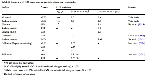 研究意義:直接證明了碳源選擇對N?O排放量的顯著影響,乙酸鈉作為碳源能有效降低MLE工藝的N?O排放。數據來自圖3和表2。