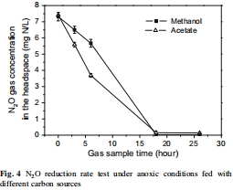 數據內容:乙酸鈉馴化污泥的N?O還原速率(10.3 mg/gVSS/h)顯著高于甲醇馴化污泥(3.3 mg/gVSS/h)。