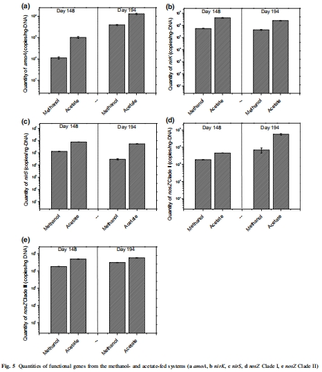數據內容:qPCR結果顯示,乙酸鈉系統中N?O還原酶基因(nosZClade I 和 Clade II)的拷貝數高于甲醇系統。