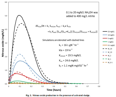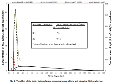 數(shù)據(jù)內(nèi)容:在存在活性污泥的條件下,添加羥胺后測得的溶解N?O濃度遠(yuǎn)高于純非生物實驗。