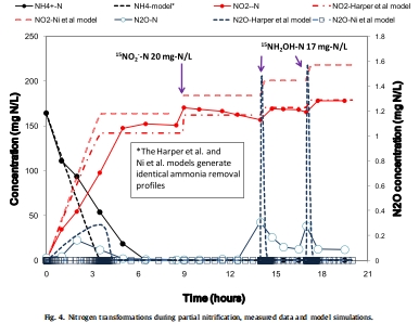 模型驗證:將新模型(稱為Harper等人模型)與未修改的模型(Ni等人模型)進(jìn)行比較,使用獨立進(jìn)行的動態(tài)負(fù)荷實驗數(shù)據(jù)來驗證模型預(yù)測氨氮去除、亞硝酸鹽生成以及N?O排放動態(tài)的能力。