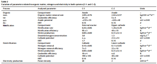數據內容:有機物(COD)去除速率(約2.02-2.09 kg COD m?3 d?1)和氮去除速率(0.11-0.16 kg N m?3 d?1)。C-1系統實現了完全硝化(效率95%),而C-2系統陰極有亞硝酸鹽積累。