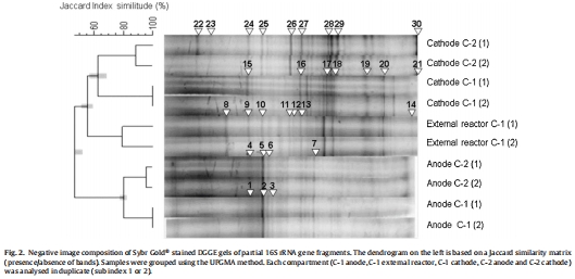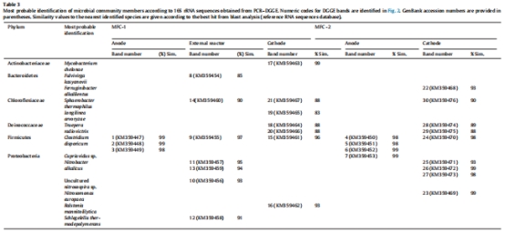 陽極群落:DGGE圖譜顯示優勢條帶單一,鑒定為Clostridium disporicum(一種梭菌)。FISH技術檢測到Geobacter sulfurreducens(地桿菌)的存在。