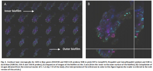 研究意義:表明不同的運行條件(如溶解氧、載體)選擇了不同的硝化微生物種群。C-2系統中 N. europaea 的出現可能與亞硝酸鹽積累有關。數據來自表3,空間分布見圖3。