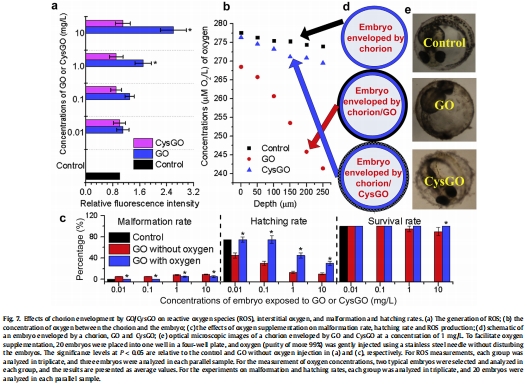 數據內容:在胚胎絨毛膜內250μm深度處,GO暴露組氧氣濃度(~241.4 μM)顯著低于對照組(~274.0 μM)和CysGO組(~269.5 μM)。研究意義:直接證實了GO的包裹造成了胚胎局部缺氧微環境,而CysGO是“透氣”的。這是解釋兩者毒性差異的關鍵物理機制證據。數據來自圖7b。