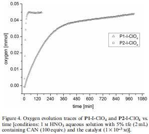 催化性能評(píng)估:在化學(xué)驅(qū)動(dòng)的水氧化體系(以硝酸高鈰銨CAN為氧化劑)中,比較懸掛配合物(P2-I)與參考配合物(P1-I)的催化活性(轉(zhuǎn)換數(shù)TON、轉(zhuǎn)換頻率TOF)和穩(wěn)定性。