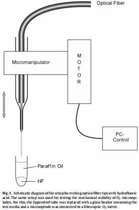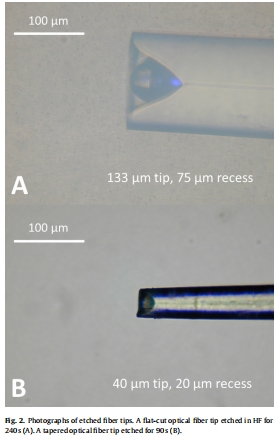 本文報道了一種用于在多模漸變折射率光學玻璃纖維上制造凹槽式尖端的新方法。該方法基于使用40%氫氟酸對光纖尖端進行受控時間的蝕刻。由于在多模漸變折射率光纖中,從纖芯中心開始的徑向蝕刻速率遞減,因此可以在平坦切割的錐形或非錐形光纖尖端形成凹槽。蝕刻后的光纖尖端改善了從光纖另一端耦合入射的激發光的聚焦效果,并能非常有效地激發固定在凹槽內的薄層光學指示劑。將傳感器化學物質固定在凹槽式光纖尖端內能得到良好保護,從而可以構建具有更高機械穩定性的O2微光極,使其即使在高粘附性的生物膜、組織和干燥土壤中也能進行重復測量。