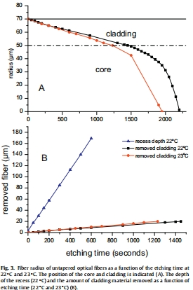 數據內容:測量了在22°C和23°C下,光纖半徑(纖芯和包層)隨蝕刻時間的變化。發現包層蝕刻速率恒定(~0.014 μm/s at 22°C),而纖芯中心蝕刻速率最快(~0.28 μm/s at 22°C),導致形成拋物線形凹槽。