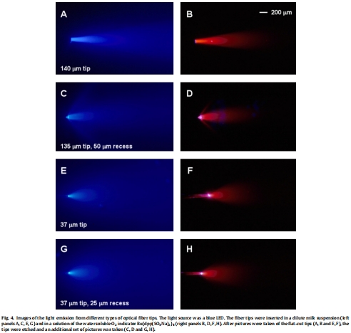 光學性能:將光纖耦合至光源,在稀釋牛奶懸浮液或水溶性O2指示劑溶液中,觀察并比較不同尖端的光場分布和激發效率。