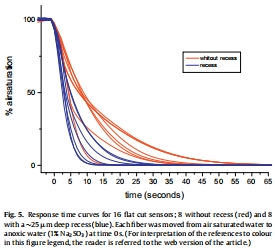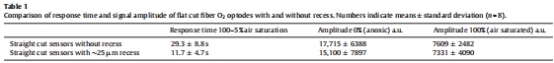 響應時間與信號幅度:數據顯示,具有~25μm凹槽的平頭傳感器的響應時間(11.7 ± 4.7 s)顯著快于無凹槽的平頭傳感器(29.3 ± 8.8 s),而兩者在空氣飽和水和無氧水中的信號幅度無顯著差異。這些數據來自文本中表1的總結,原始響應曲線見圖5。