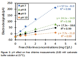 數據內容:在相同游離氯濃度下,電極信號隨pH降低而顯著增強(如在pH 7.0時斜率為57.1 pA/(mg Cl?/L),在pH 10.0時為7.7 pA/(mg Cl?/L))。