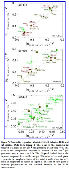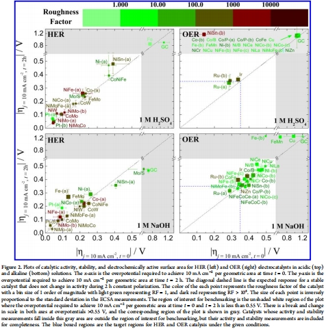 數(shù)據(jù)內(nèi)容:所有催化劑達(dá)到10 mA cm?2所需的初始和2小時(shí)后過電位,以及估算的粗糙度因子。這些數(shù)據(jù)被整合在圖2的綜合圖中,其中x軸為ηt=0,y軸為ηt=2h,點(diǎn)的顏色代表RF的大小。