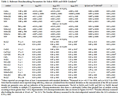 數(shù)據(jù)內(nèi)容:在固定過電位(HER為-0.10 V,OER為+0.35 V)下,按ECSA歸一化的電流密度。數(shù)據(jù)匯總在支持信息的表S3-S6中,部分精選催化劑的數(shù)據(jù)見表2。