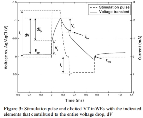 數據內容:記錄了在施加刺激脈沖時,電極/電解質界面上的電壓隨時間變化的完整曲線。圖3展示了一條典型的電壓瞬變曲線,并標注了Eipp, Va, dEp等關鍵參數點。