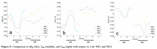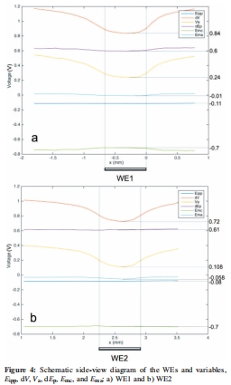 數據內容:包括Eipp, dV(總電壓降), Va, dEp, Emc, Ema。圖4以示意圖形式展示了WE1和WE2的這些參數的平均值。例如,WE1的dEp為0.59 V,Va為0.24 V;WE2的dEp為0.615 V,Va為0.109 V。