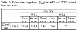 數據內容:通過兩次獨立掃描計算出的WE1和WE2的|Zpol|。WE1的平均|Zpol|為237.1 Ω,WE2為251 Ω。數據匯總在文中的表3。