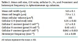 數據內容:平均細胞體積為155 μm3,碳含量為2.7 ± 0.3 pmol C cell?1,C:N摩爾比為6.31 ± 0.02,異形胞頻率為2.0%。