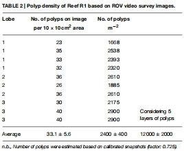 數(shù)據(jù)內(nèi)容:ROV視頻分析顯示,珊瑚礁R1由活珊瑚框架(53%)、混合框架(8%)、死珊瑚框架(12%)和珊瑚碎石(27%)組成。珊瑚息肉密度通過(guò)校準(zhǔn)圖像估算,平均為24,000±2,000個(gè)息肉 m?2(考慮5層結(jié)構(gòu))。數(shù)據(jù)來(lái)自表2(息肉密度)和表4(棲息地貢獻(xiàn)率)。