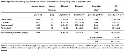 數(shù)據(jù)內(nèi)容:海綿地中主要物種(如Geodia barretti)的密度、直徑和生物量(干重0.63±0.3 kg m?2),呼吸率標(biāo)準(zhǔn)化為0.036 mmol O? g DW?1 d?1。總社區(qū)呼吸率計(jì)算為45.3±20.9 mmol O? m?2 d?1。數(shù)據(jù)來(lái)自表3。