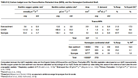數(shù)據(jù)內(nèi)容:區(qū)域上擴(kuò)顯示,在Tranena保護(hù)區(qū),珊瑚礁和海綿地占海底面積的22%,但貢獻(xiàn)了78%的總底棲呼吸;在挪威大陸架,它們處理了5%的初級(jí)生產(chǎn)碳。數(shù)據(jù)來(lái)自表5(碳預(yù)算匯總)。