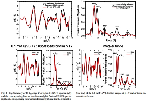 研究意義:直接證實生物膜內形成了晶質鈾酰磷酸鹽礦物(類似meta-autunite),為“生物礦化”提供分子水平證據。數據來自圖1(EXAFS光譜和傅里葉變換)和表2(擬合參數)。