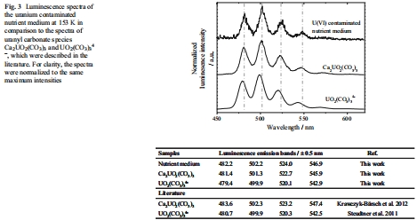 數據內容:營養介質在153 K下顯示四個熒光發射峰(482.2、502.2、524.0、546.9 nm),與Ca?UO?(CO?)?和UO?(CO?)???物種的譜圖匹配。